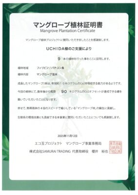 当社は、株式会社SAMURAI TRADINGが中心となって推進するエコ玉プロジェクトの一環であるマングローブ植林活動に関する証明書を正式に受領しました。このプロジェクトは、フィリピンの津波被害地を中心にマングローブの植林を行い、自然の力を活かした防災・減災を目指しています。植林されたマングローブは、地域の環境保全と生態系の再生に大きく貢献しており、私たちの持続可能な社会づくりの一助となっています。